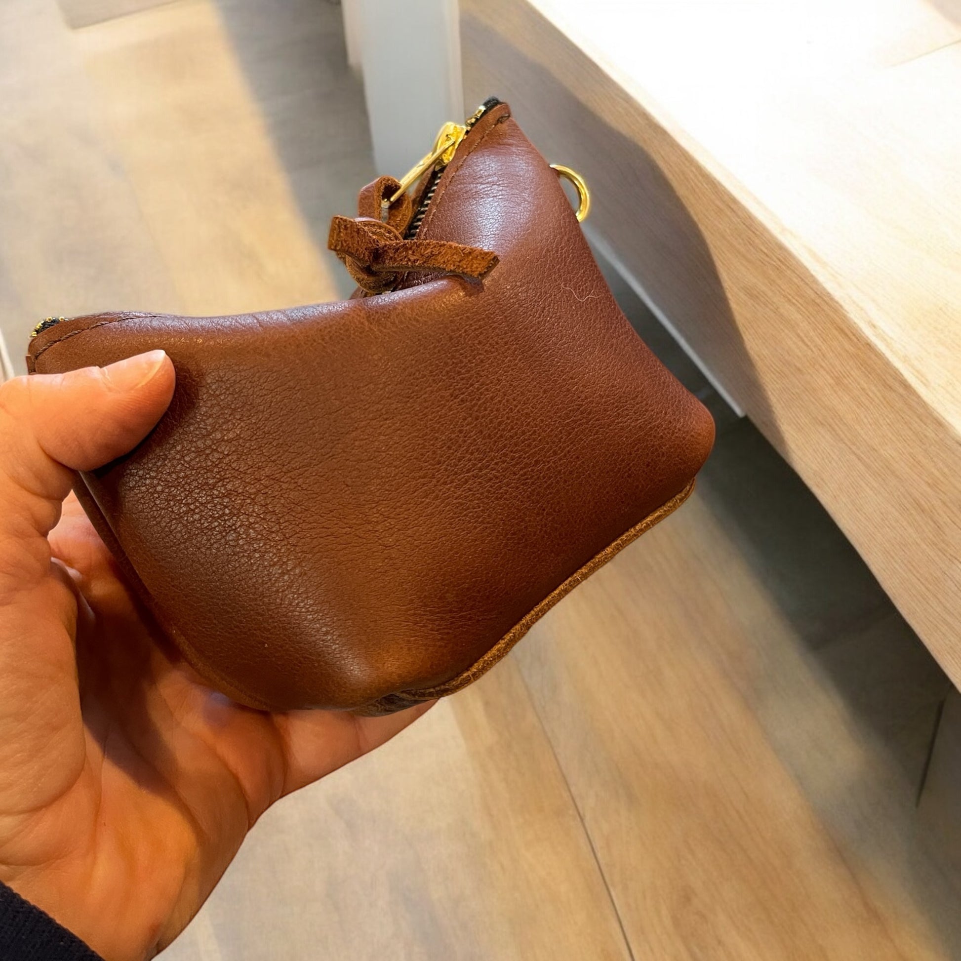 This versatile mini pouch measures approximately 6” wide, 3.5” deep, and has a 2” base. It can function as a cash or card holder, business card holder, or change purse. The brass d ring allows for easy attachment to another bag or adding a strap to turn it into a tiny wristlet.