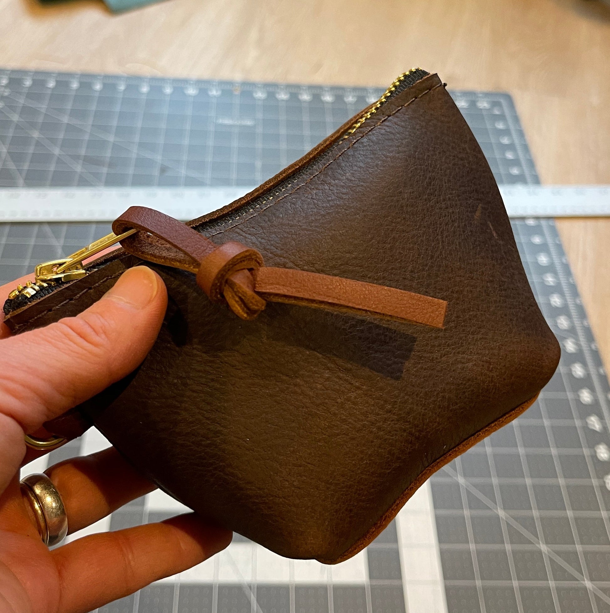 This versatile mini pouch measures approximately 6” wide, 3.5” deep, and has a 2” base. It can function as a cash or card holder, business card holder, or change purse. The brass d ring allows for easy attachment to another bag or adding a strap to turn it into a tiny wristlet.