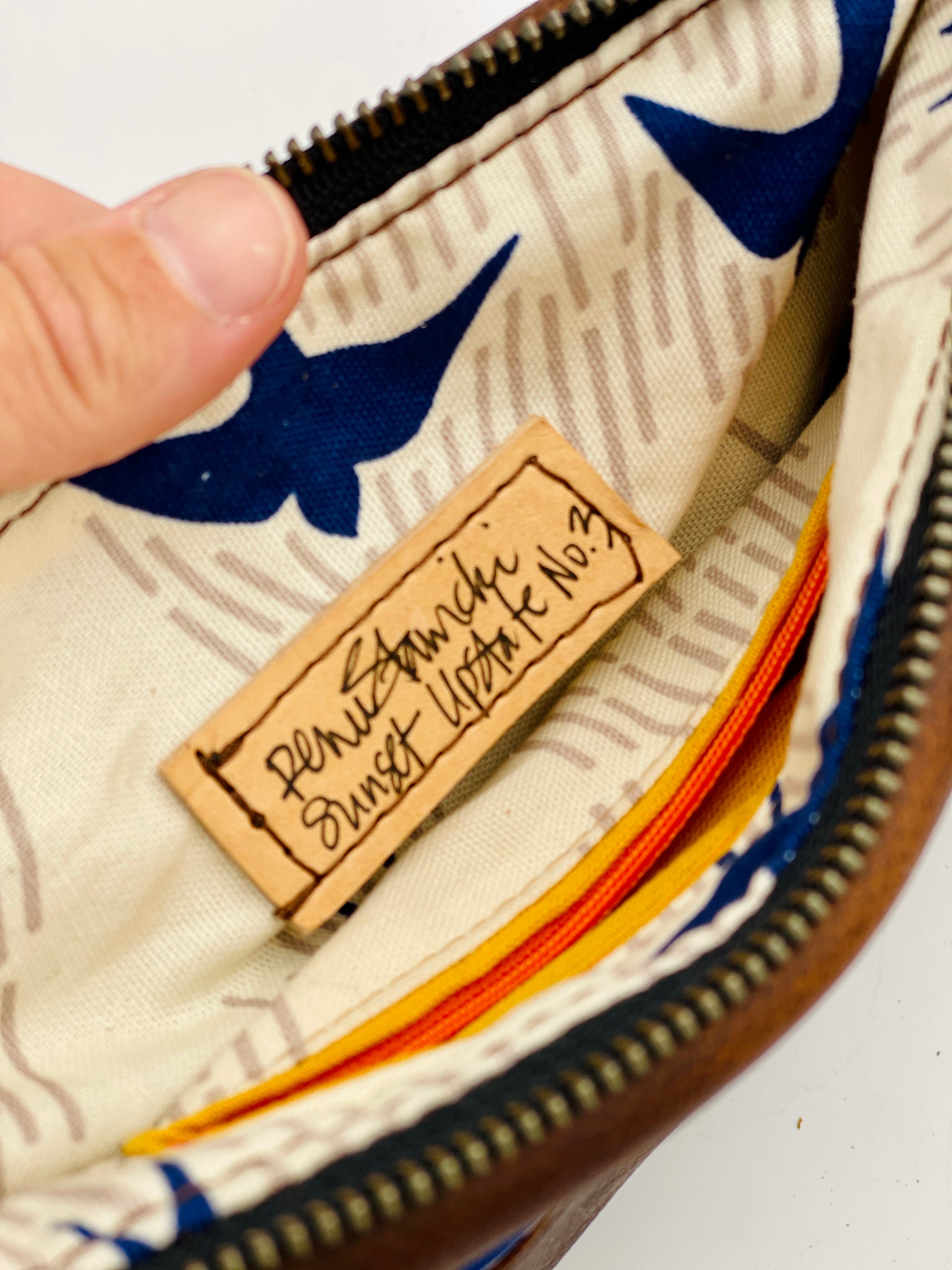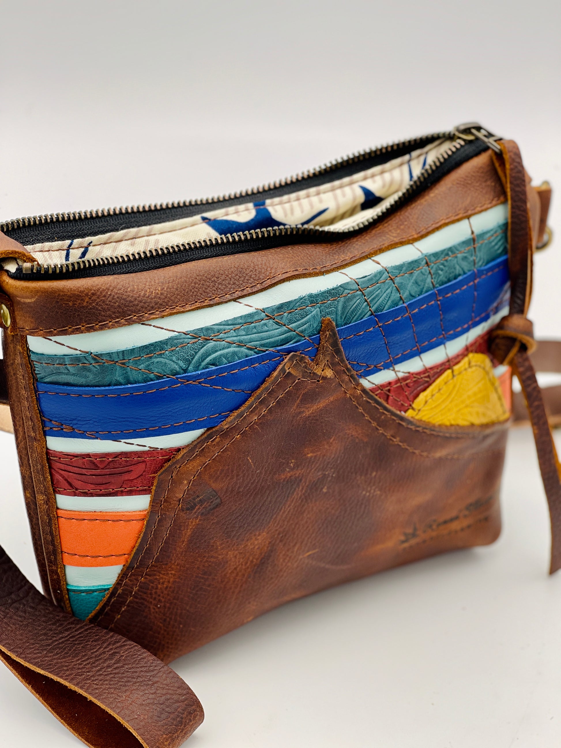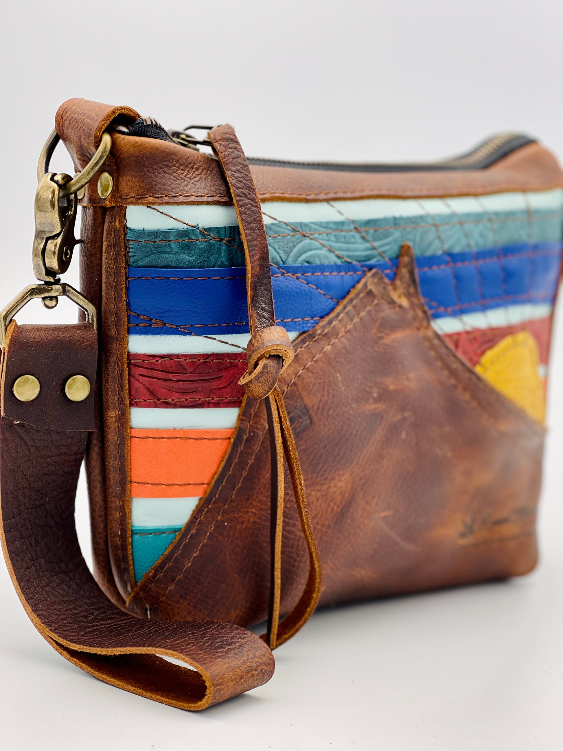 You get the best of upstate New York in one bag! This one of a kind handcrafted leather bag features a sunset inspired by the Adirondack Mts. and Lake Ontario. Premium leathers, beautiful stitching details and high quality brass hardware. Lined in bird fabric (organic canvas) and a zippered pocket lined in yellow cotton. Measurements- 10”x7” with a 2.5” base. This bag comes with a 7” wrist strap 1” wide and extra comfy.