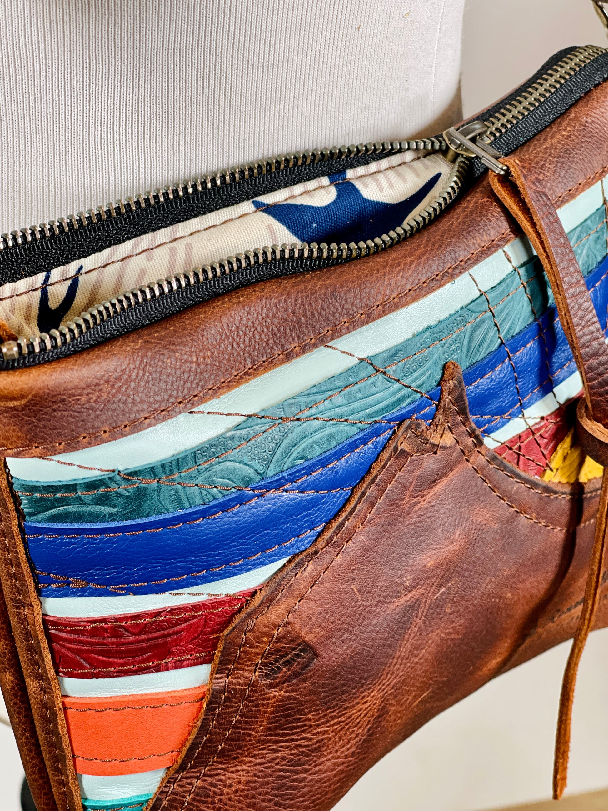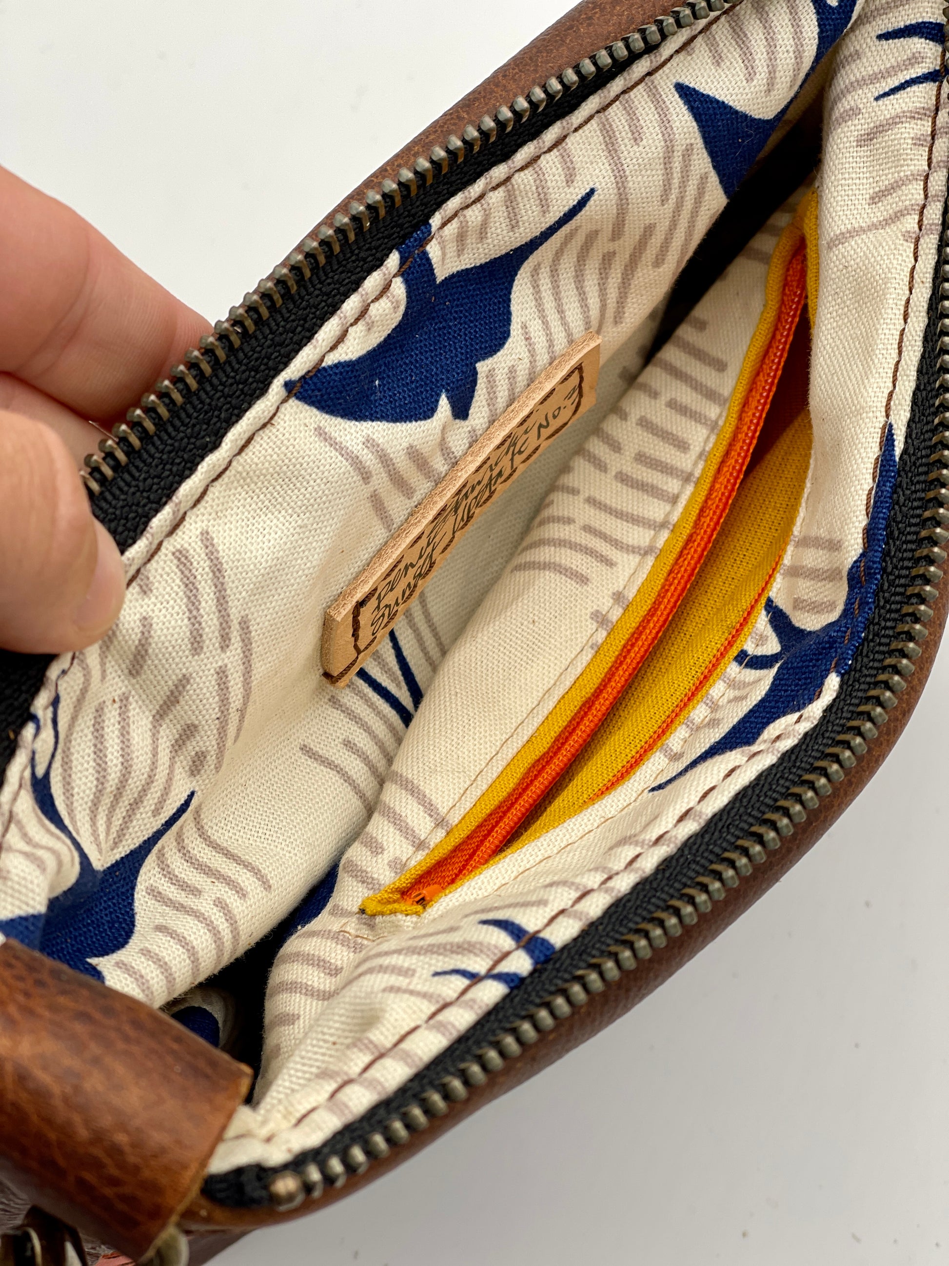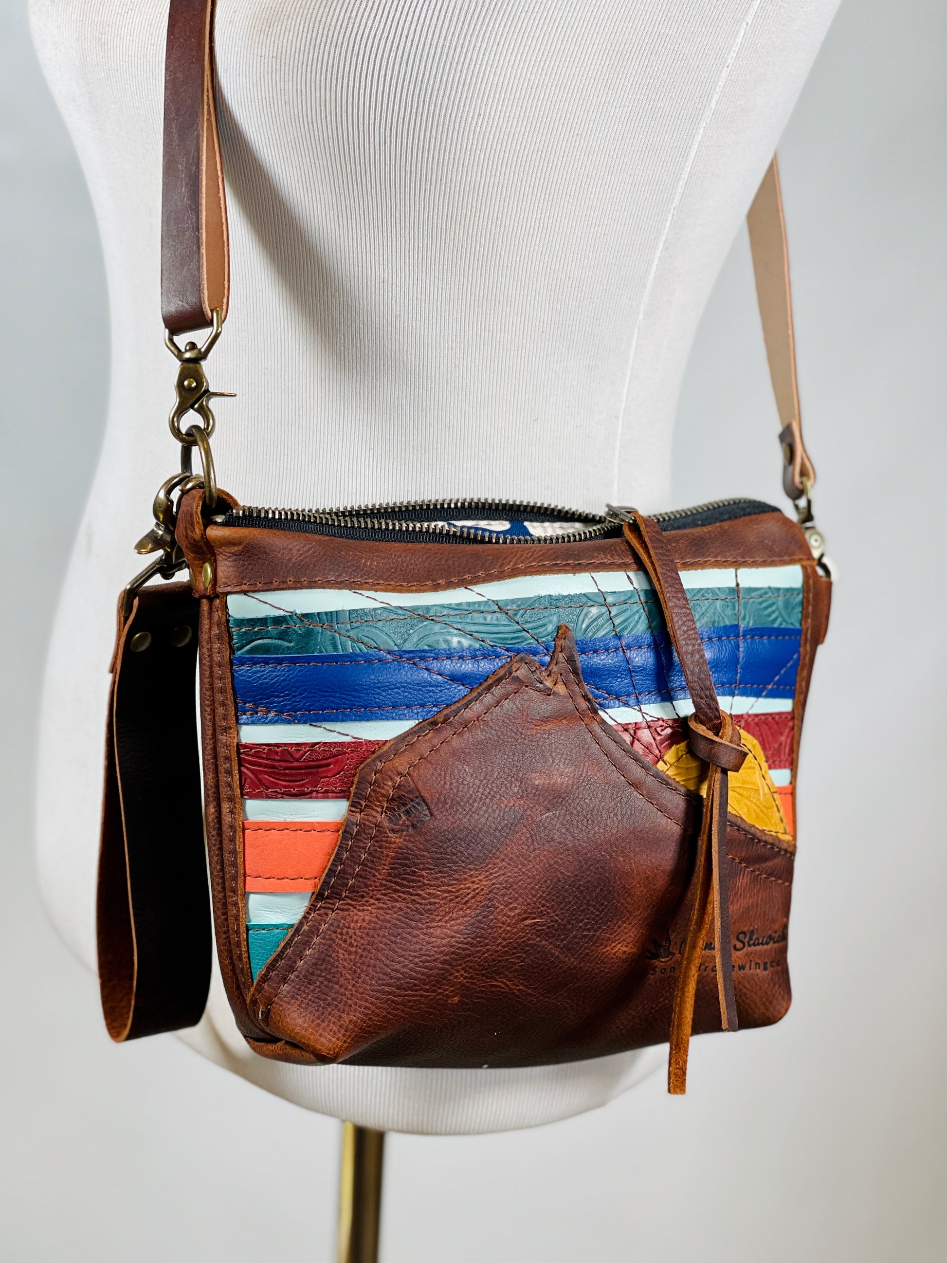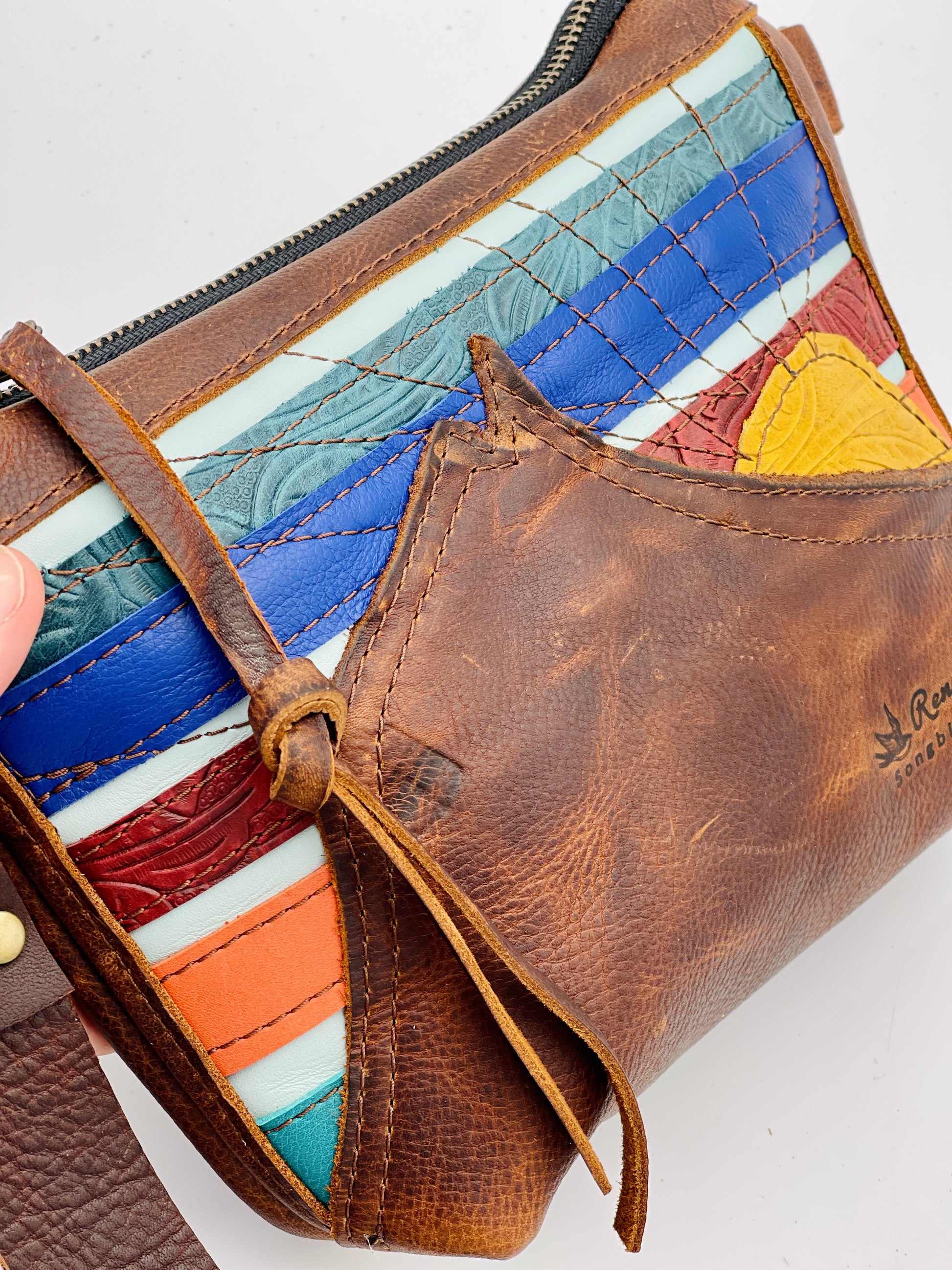You get the best of upstate New York in one bag! This one of a kind handcrafted leather bag features a sunset inspired by the Adirondack Mts. and Lake Ontario. Premium leathers, beautiful stitching details and high quality brass hardware. Lined in bird fabric (organic canvas) and a zippered pocket lined in yellow cotton. Measurements- 10”x7” with a 2.5” base. This bag comes with a 7” wrist strap 1” wide and extra comfy.