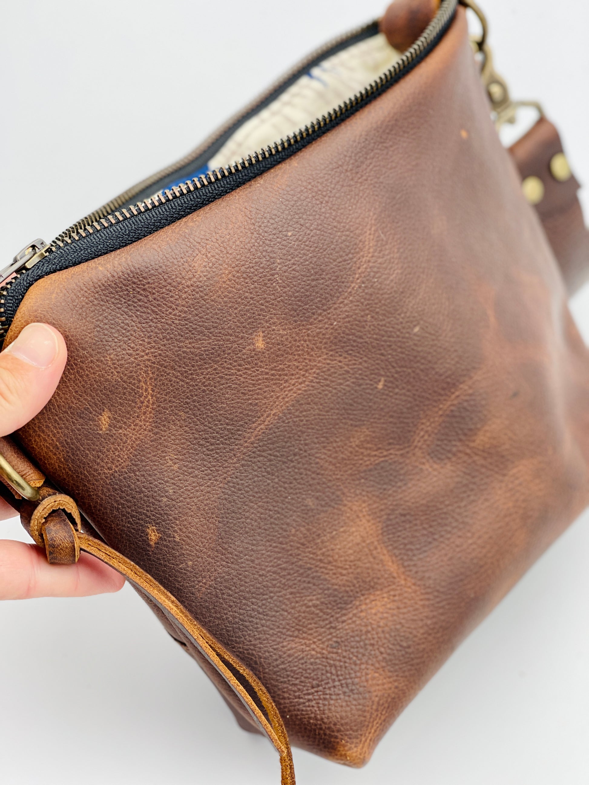 Crossbody strap sold separately, (3/4” brown leather strap is hand dyed veg tanned leather abd can be added to your cart for an extra 25$ by adding a note to checkout, we will invoice you separately, no extra shipping!) message us if you’d like other strap options. Leather is a natural material and we celebrate the variations in color/unique markings that make each of these bags unique!