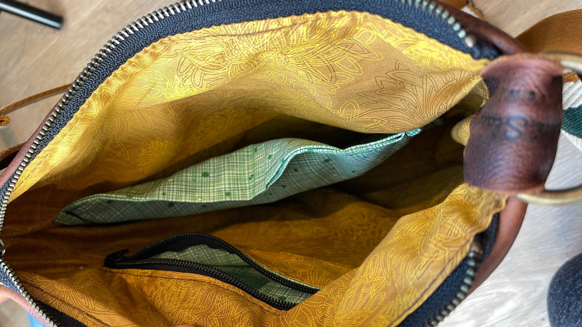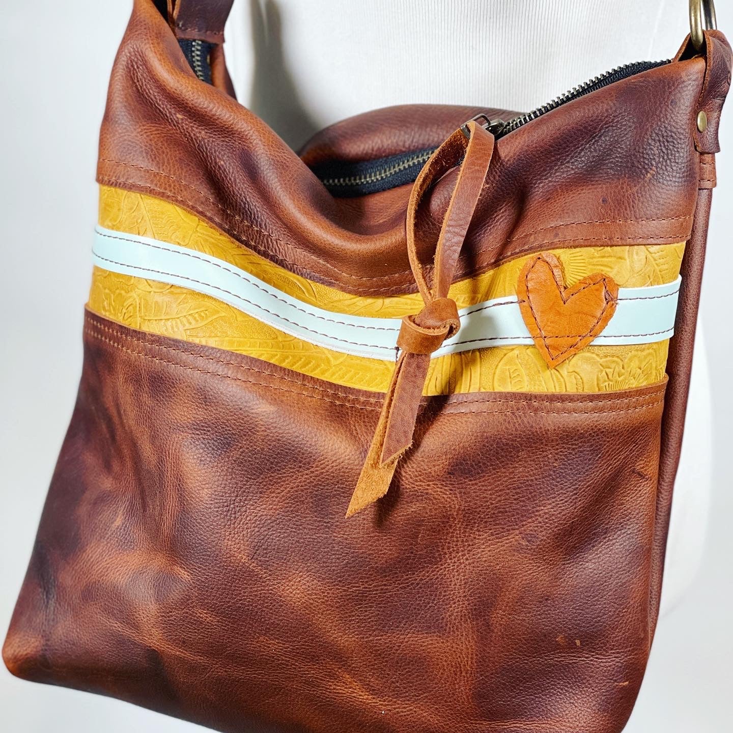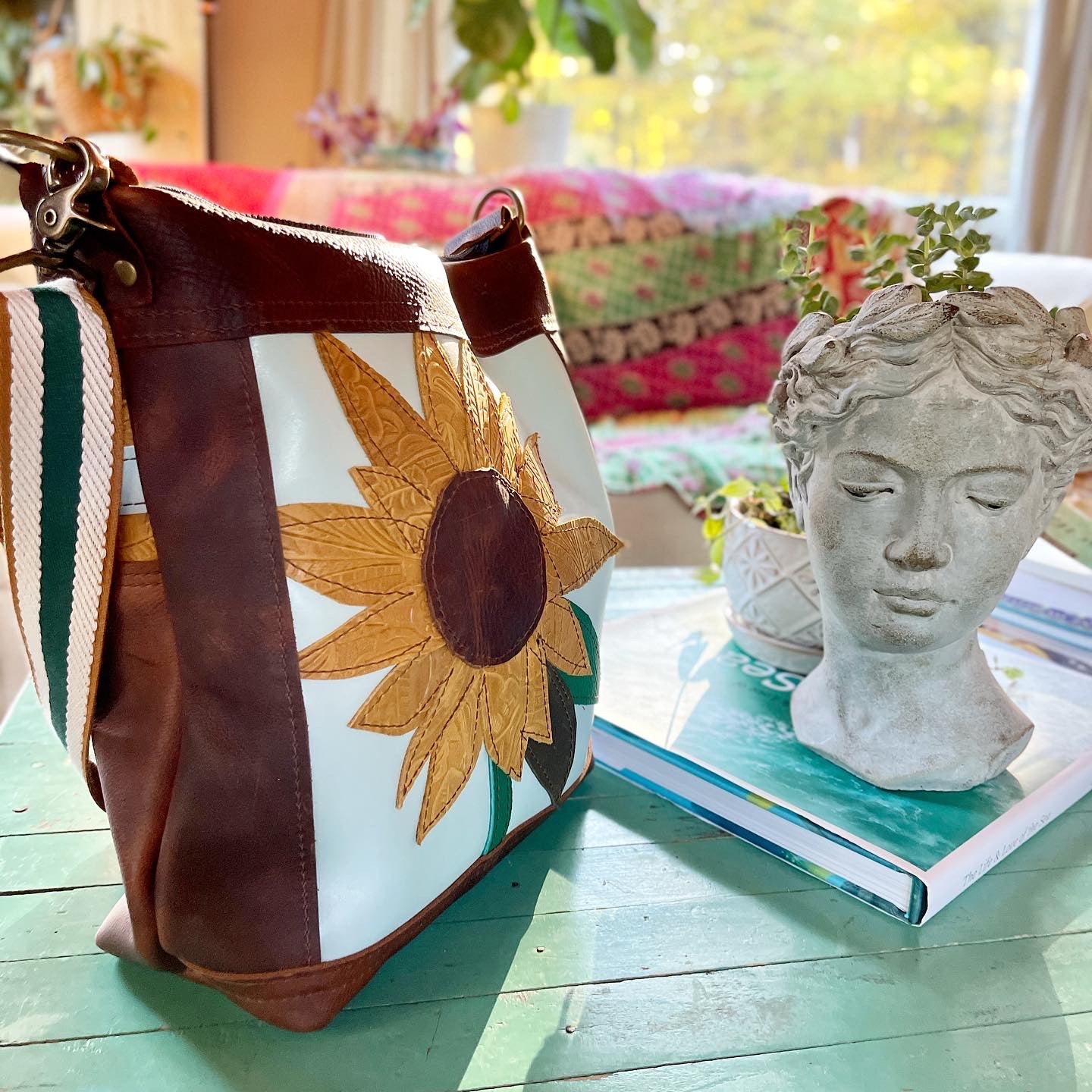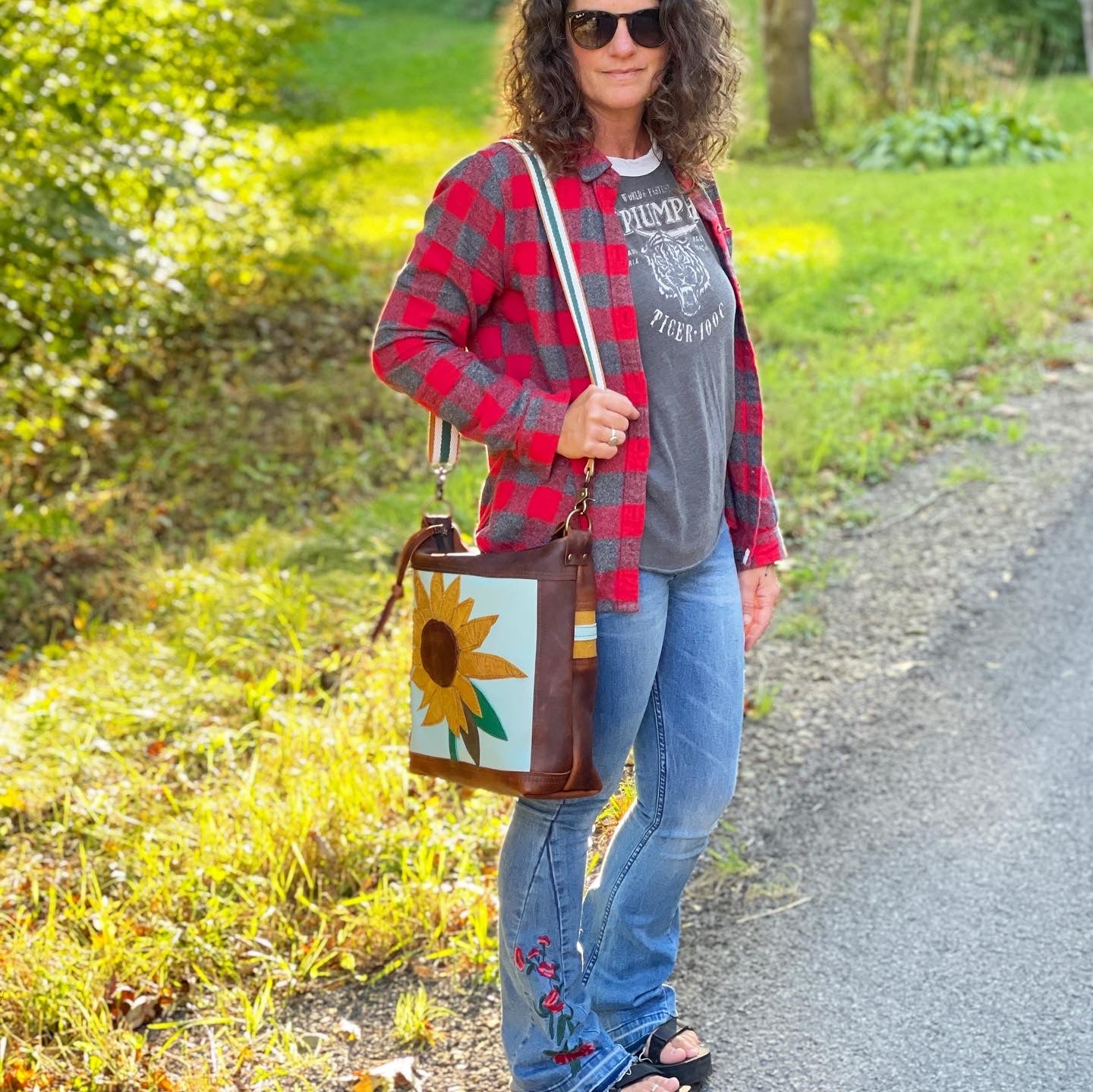 This one of a kind leather shoulder tote was inspired by the field of sunflowers planted at Old McDonald’s Farm every year! We drive by there on our way to the boat and we just love to see them! This beautiful family owned farm is located in Sackets Harbor NY and is definitely worth a visit- our kids love this place! This bag has so many unique features from the hand pieced / stitched sunflower to the stripe/ heart on the back. Hand tooled leather, high quality brass hardware. Measurements- 13”x 12.5” with a 6” base. Large interior zippered pocket and slip pocket. Choose from the yellow green striped strap OR the black strap, both are adjustable - indicate your preference in check out notes.