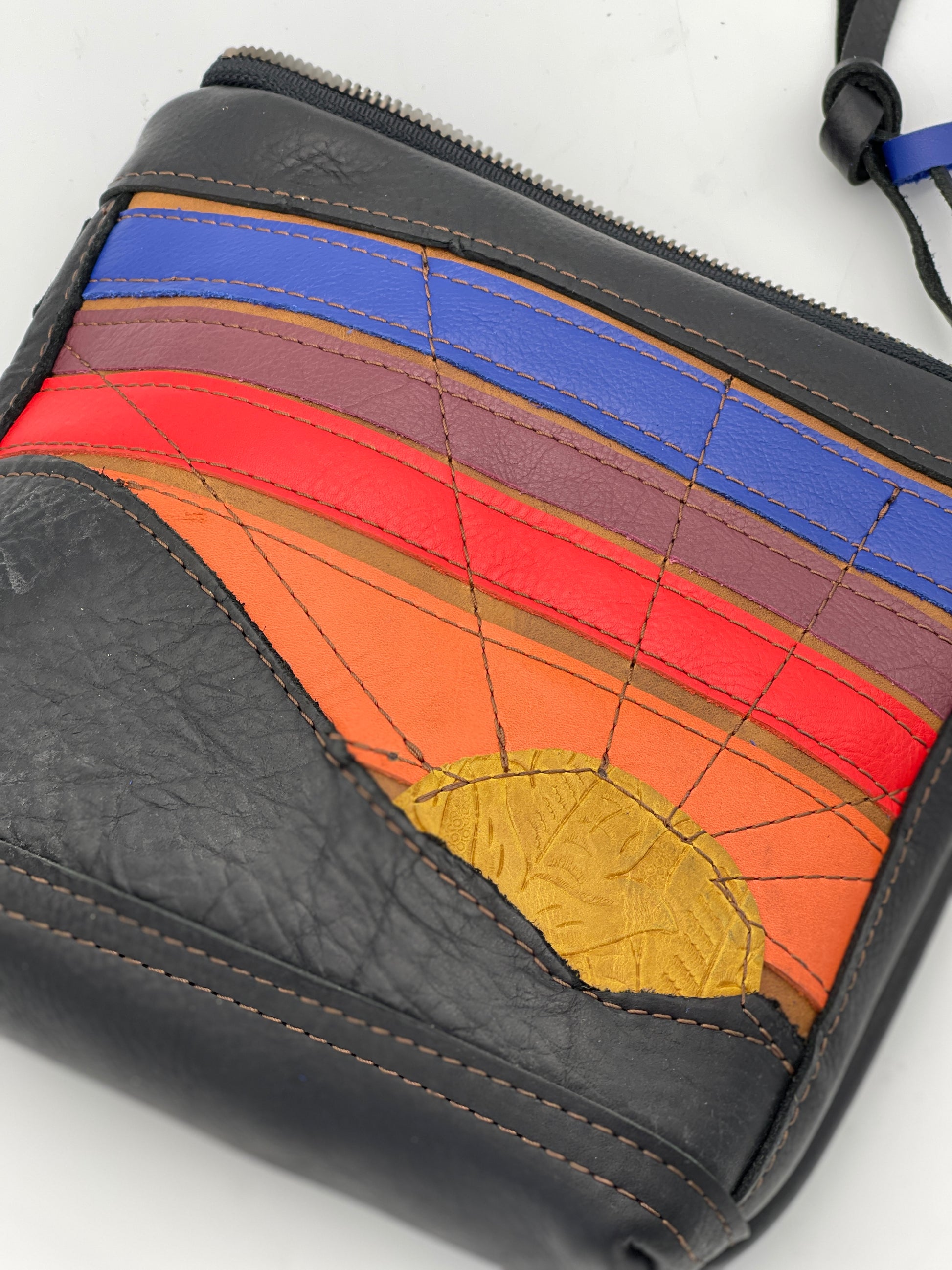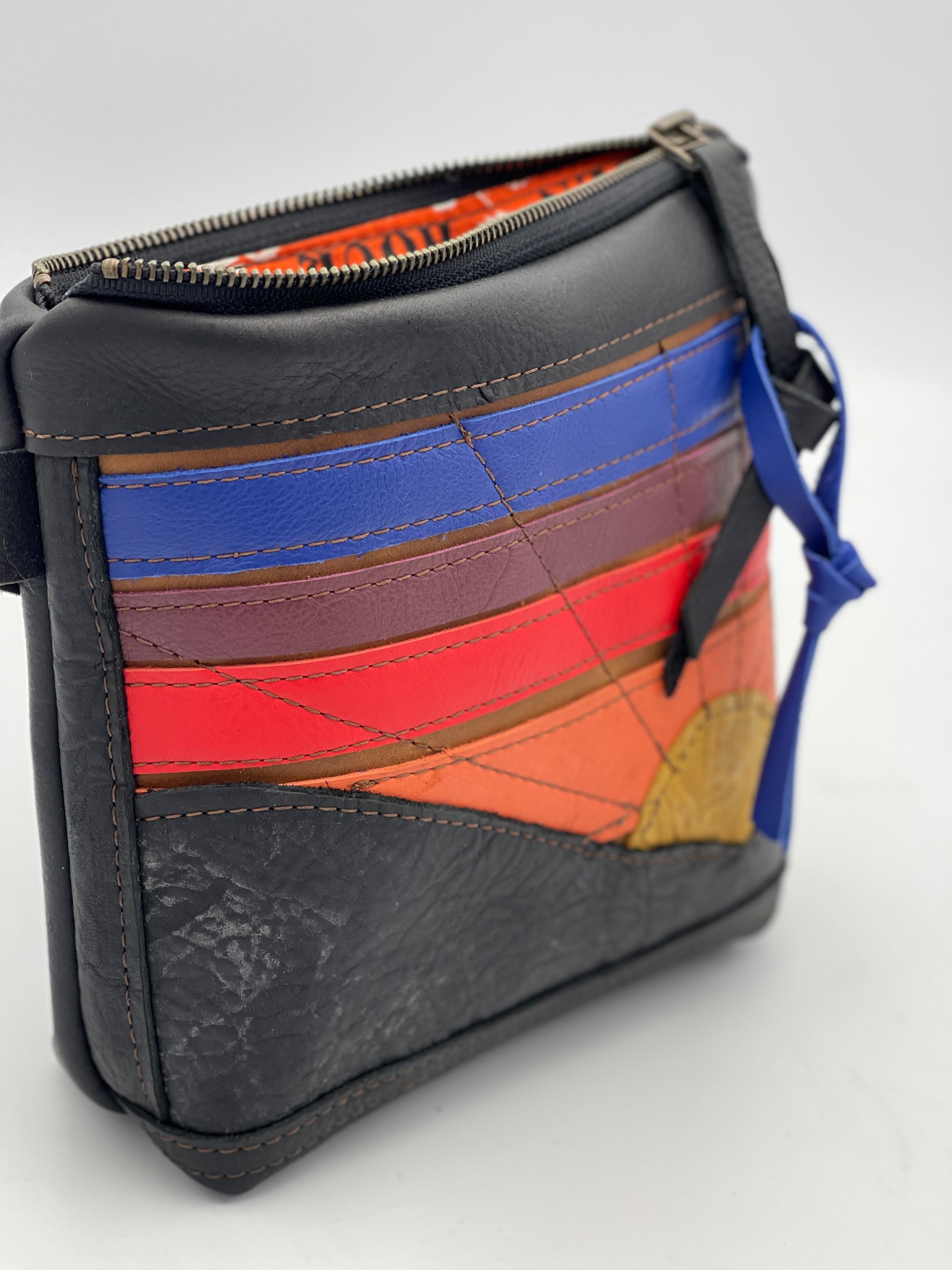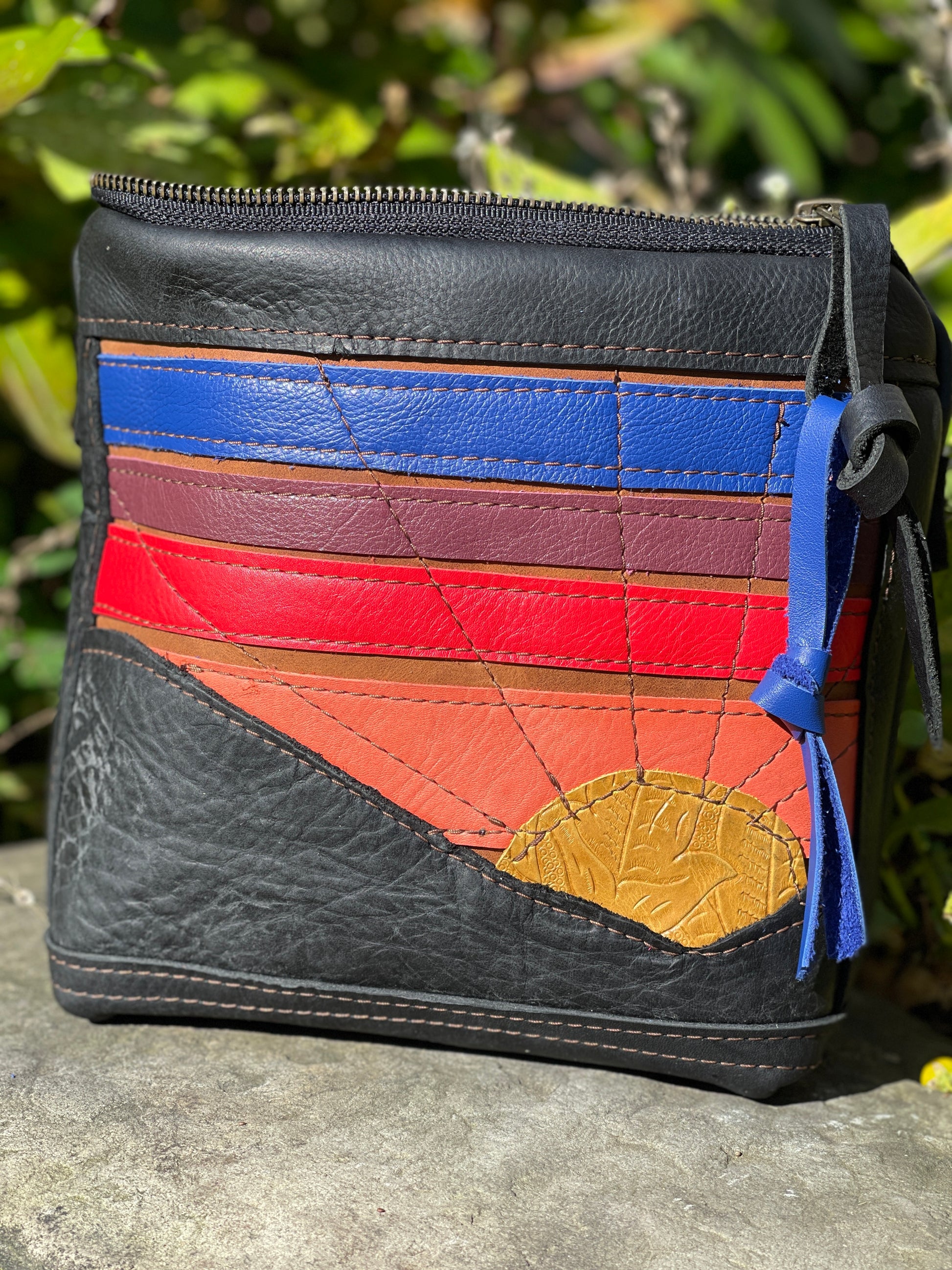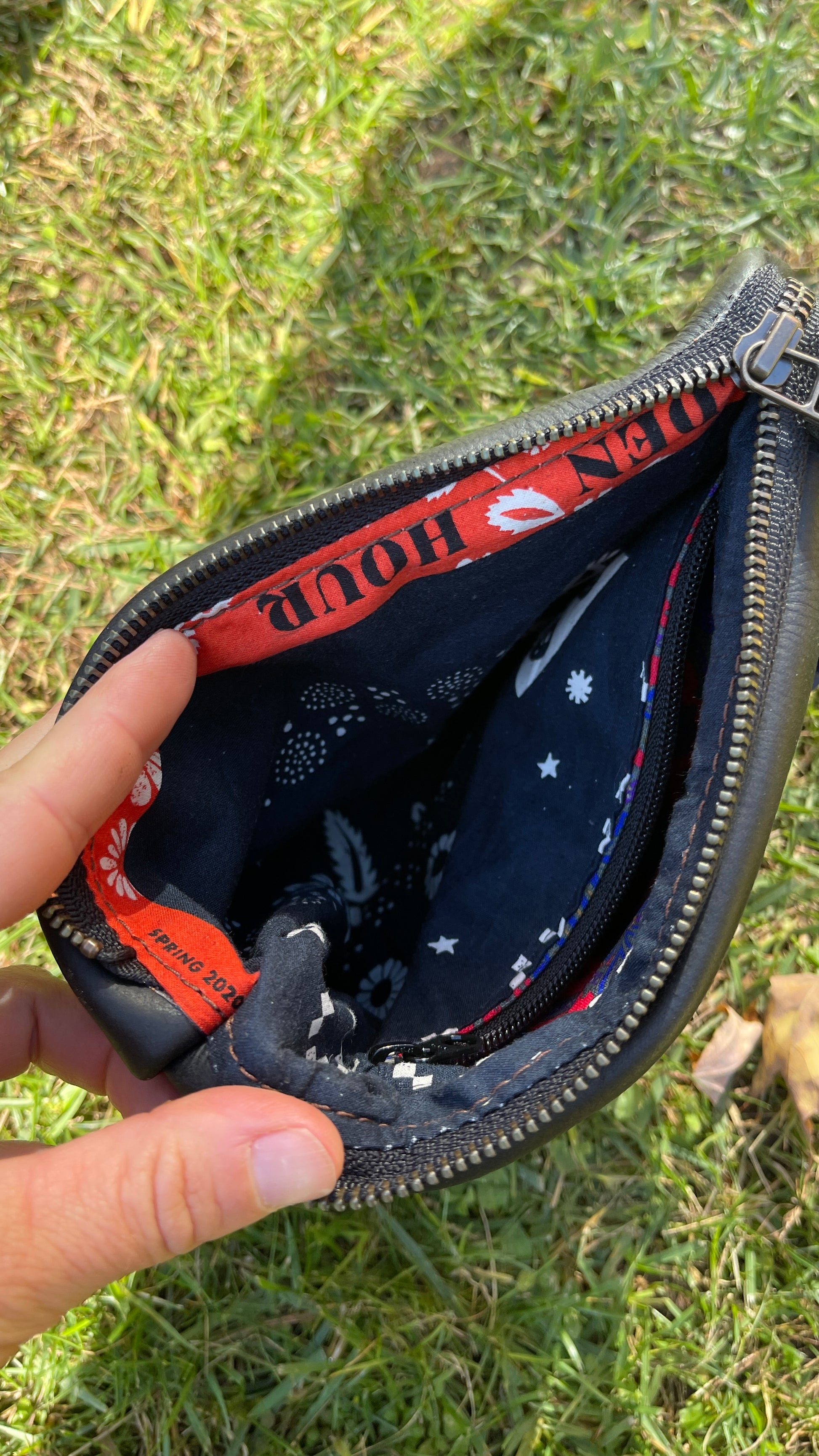 This bag was inspired by a local biker babe and her adventures in the road. Lake George is a gorgeous upstate New York gem located in the Adirondack Mountains. Measurements- 10”x 8”x 3” base, interior zippered pocket, lining in navy blue cotton bandana print, silver hardware, black leather wrist strap measures 7”.