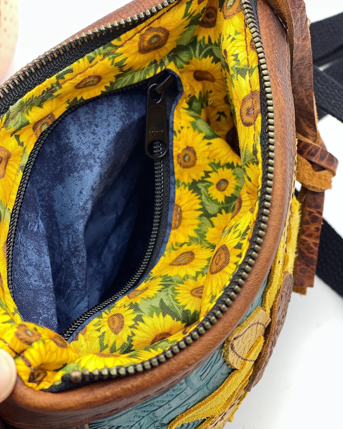 This one of a kind bag was handcrafted in upstate New York on the shores of one of the beautiful places on earth! It was inspired by the beautiful fields of sunflowers planters by Old McDonalds Farm every year in Sackets Harbor, NY