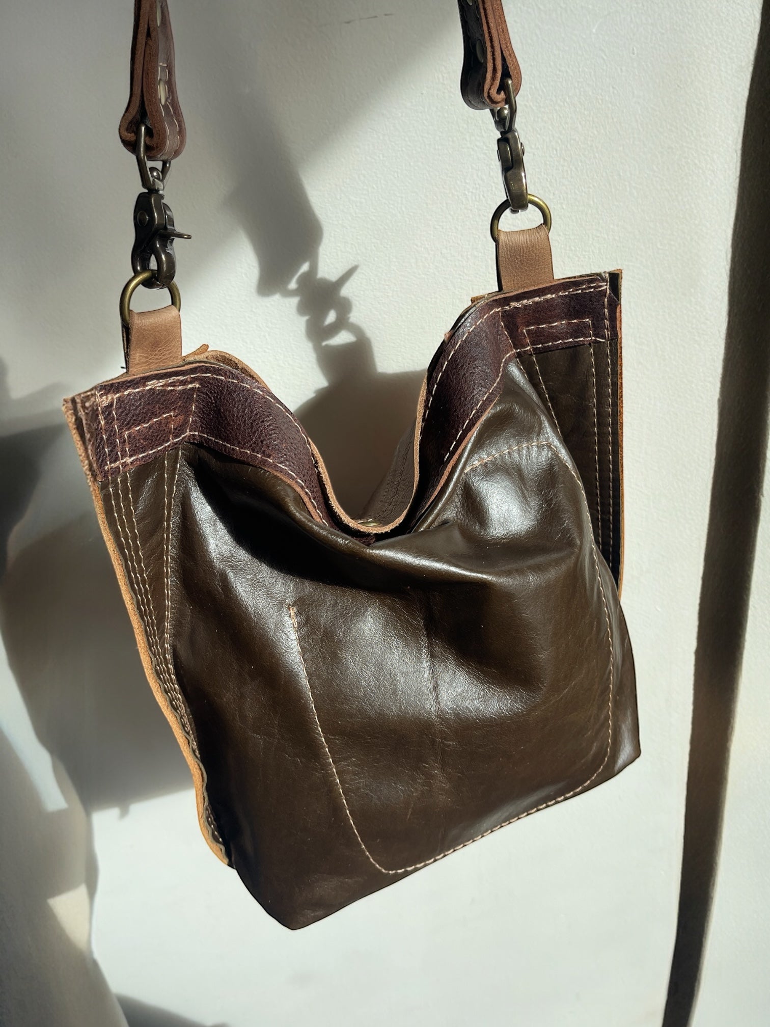 I saw another designer recreate this 1970’s retro bag and I had to give it a try! One of a kind, upcycled leathers/patchwork bag.