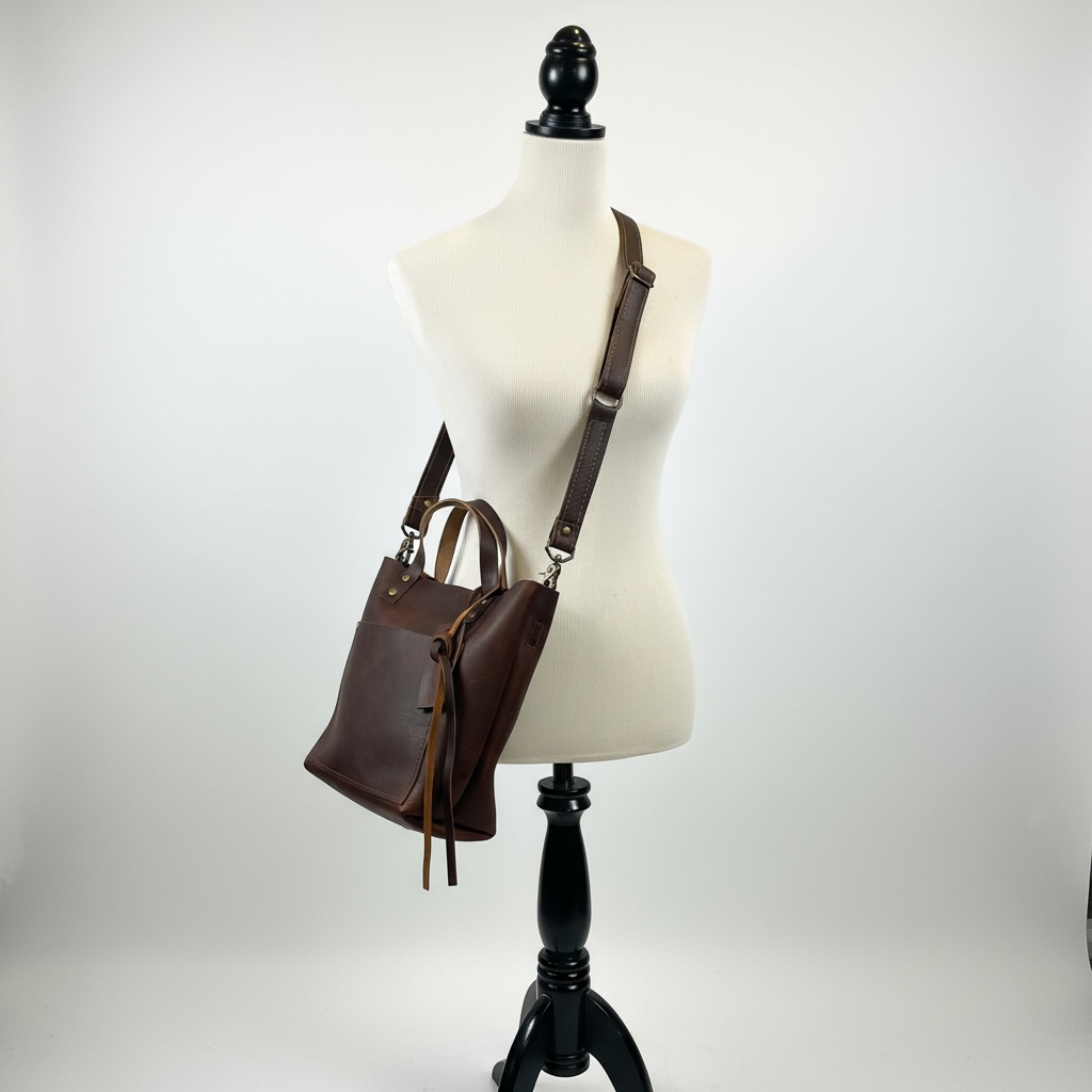 We re-worked and improved our mini tote design- again! Full grain leather, a roomy exterior slip pocket (8'x6.5"), customizable options such as an interior pocket, short handles, and adjustable shoulder strap as well as endless color options- this bag no longer has a snap at top - please message us if you'd like that option - no extra charge!!!!