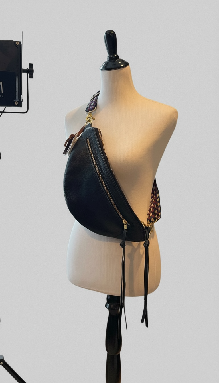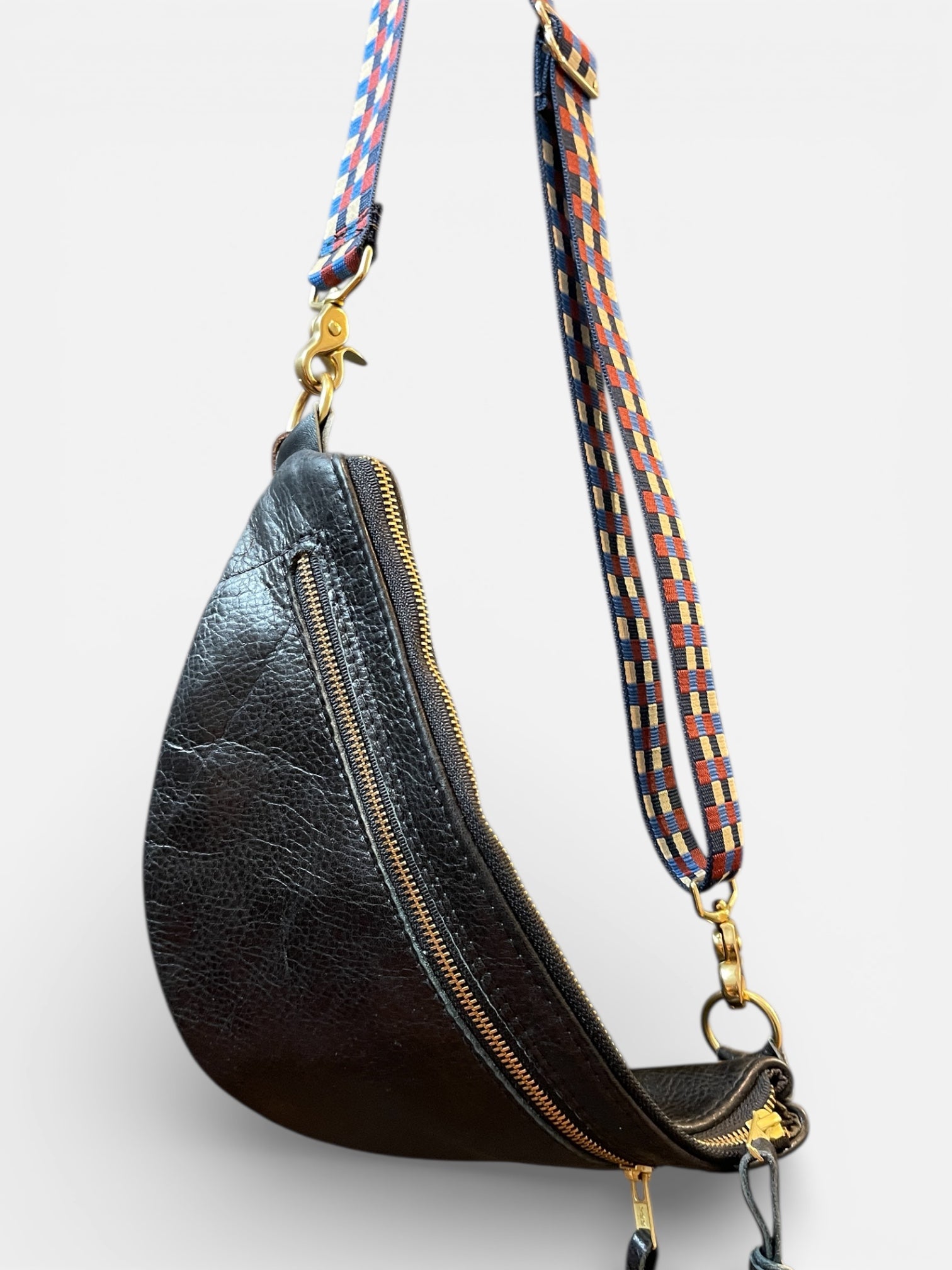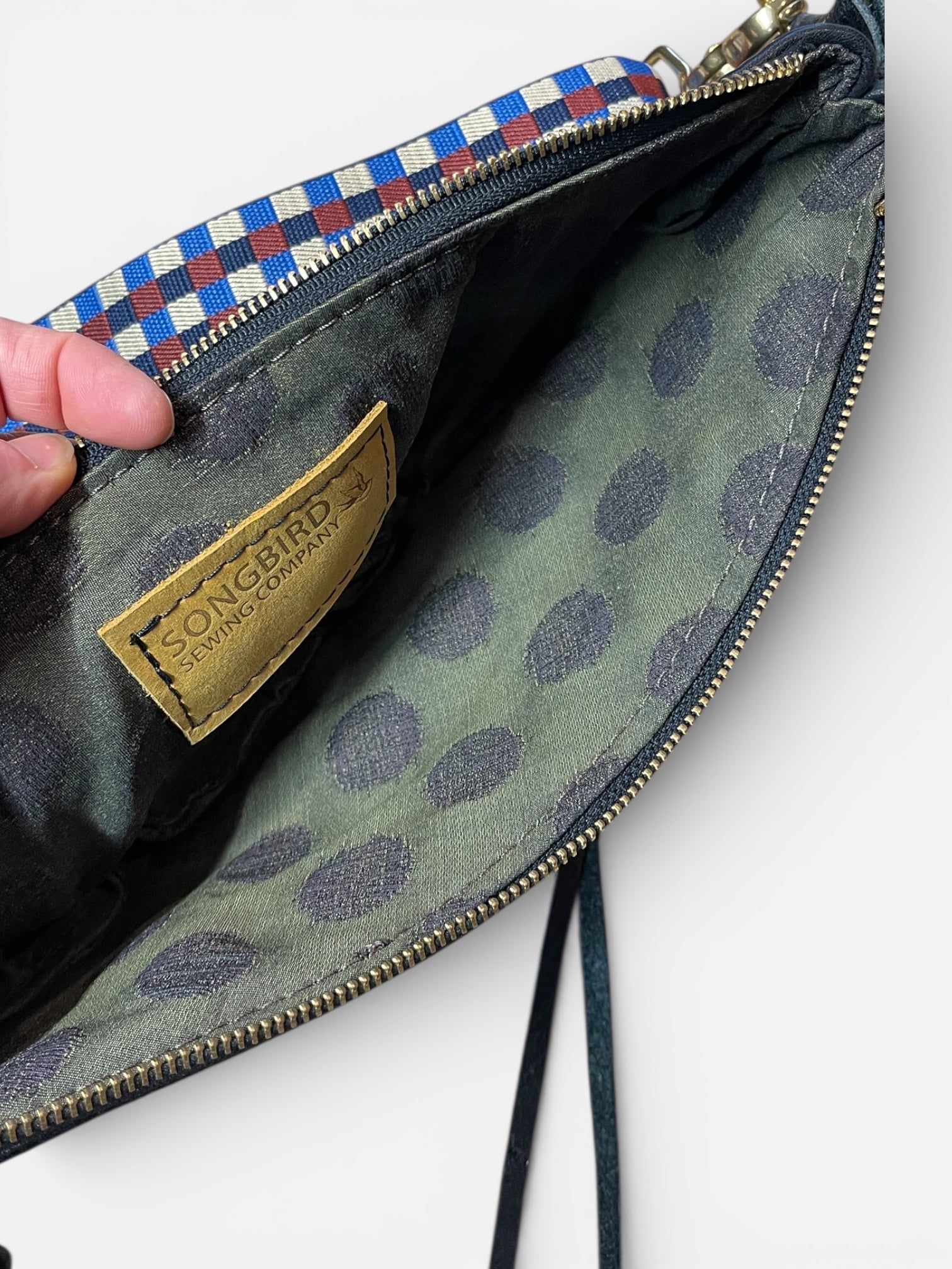 Measurements - 15” wide at top of bag, 6.5” at deep est part of bag - adjustable shoulder strap in blue checkered webbing - zippered front pocket 11.5” wide