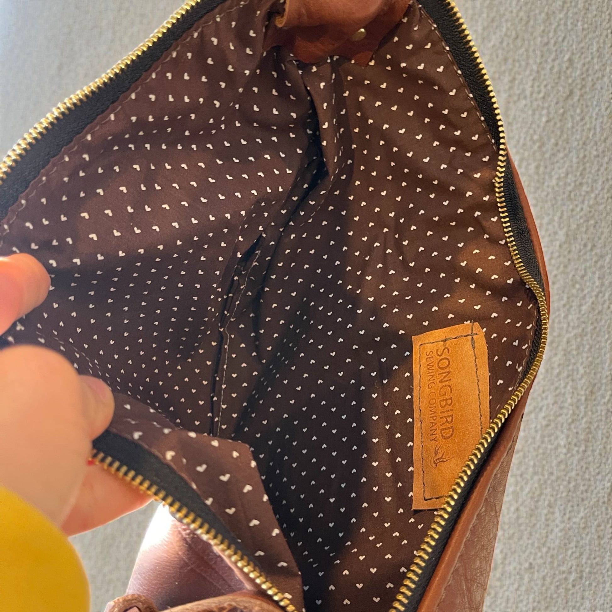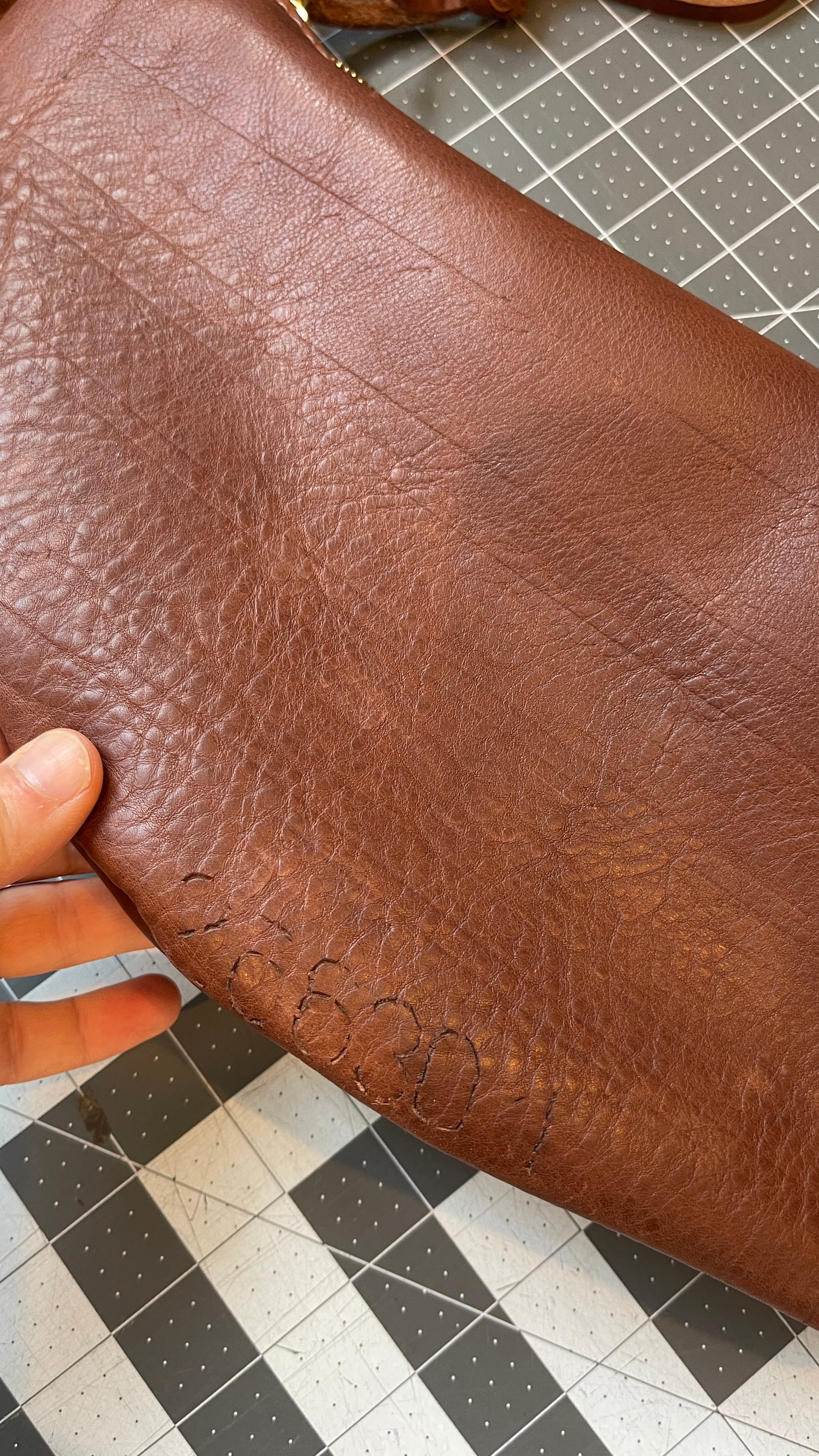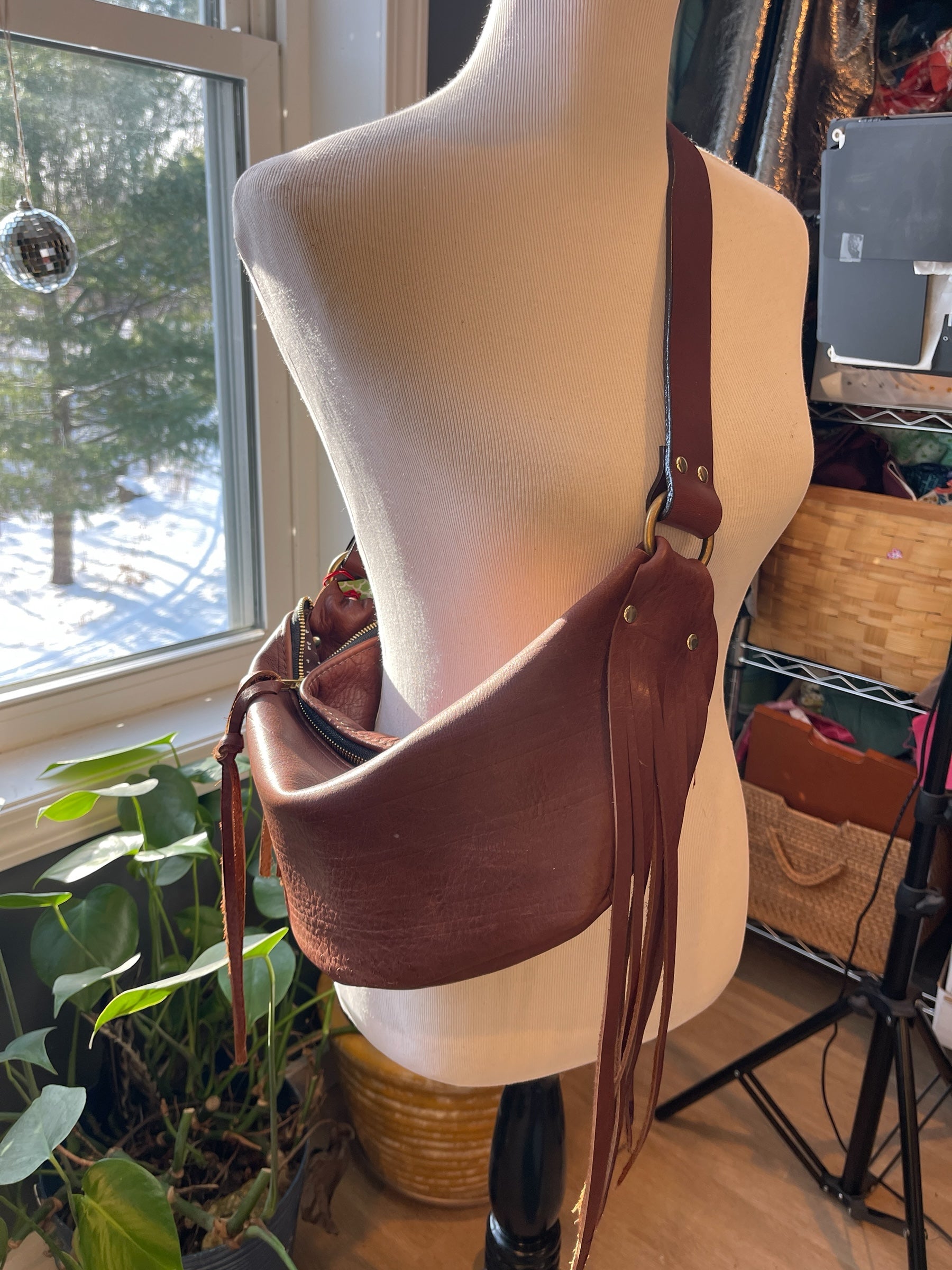 details - the leather has some distressing and lines embossed on it - numbers 266301 on one side and heart patch sewn on one side, hand cut fringe, repurposed belt strap