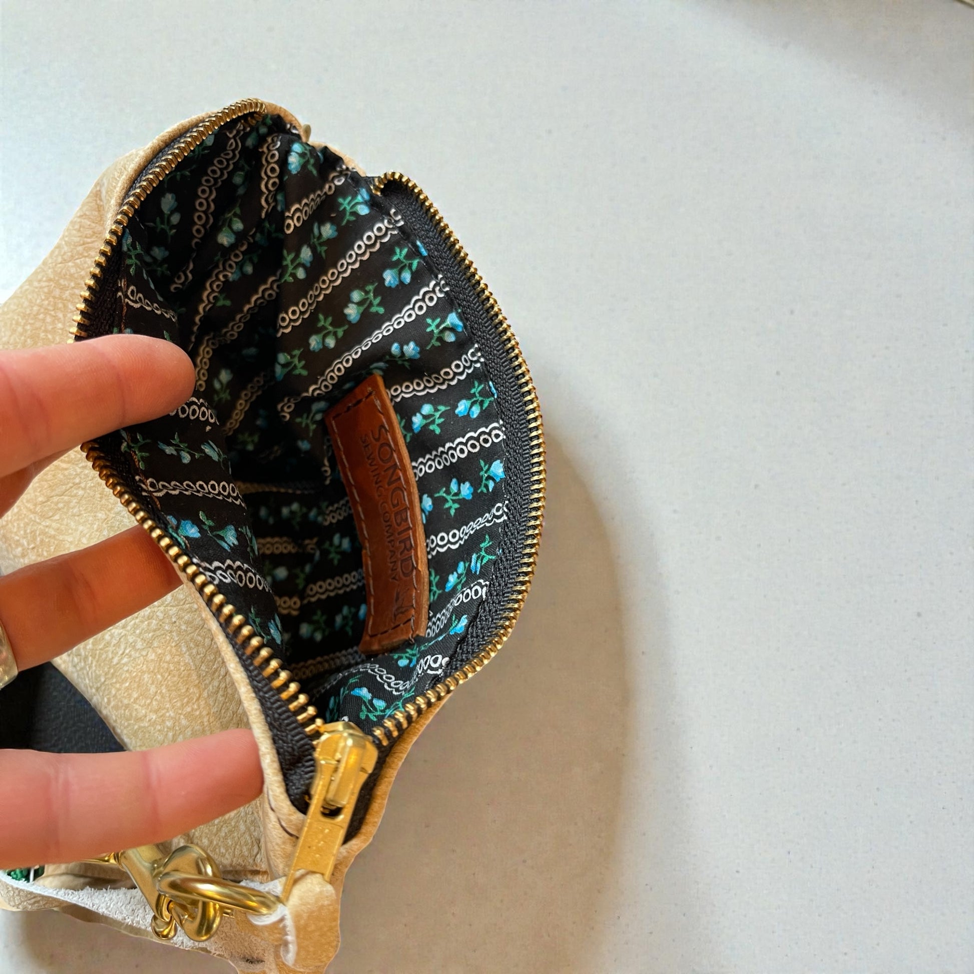 This one of a kind beauty is lined in a sweet vintage floral cotton print, soft camel/sand sueded leather - gold brass hardware - hand cut fringe - black leather adjustable strap