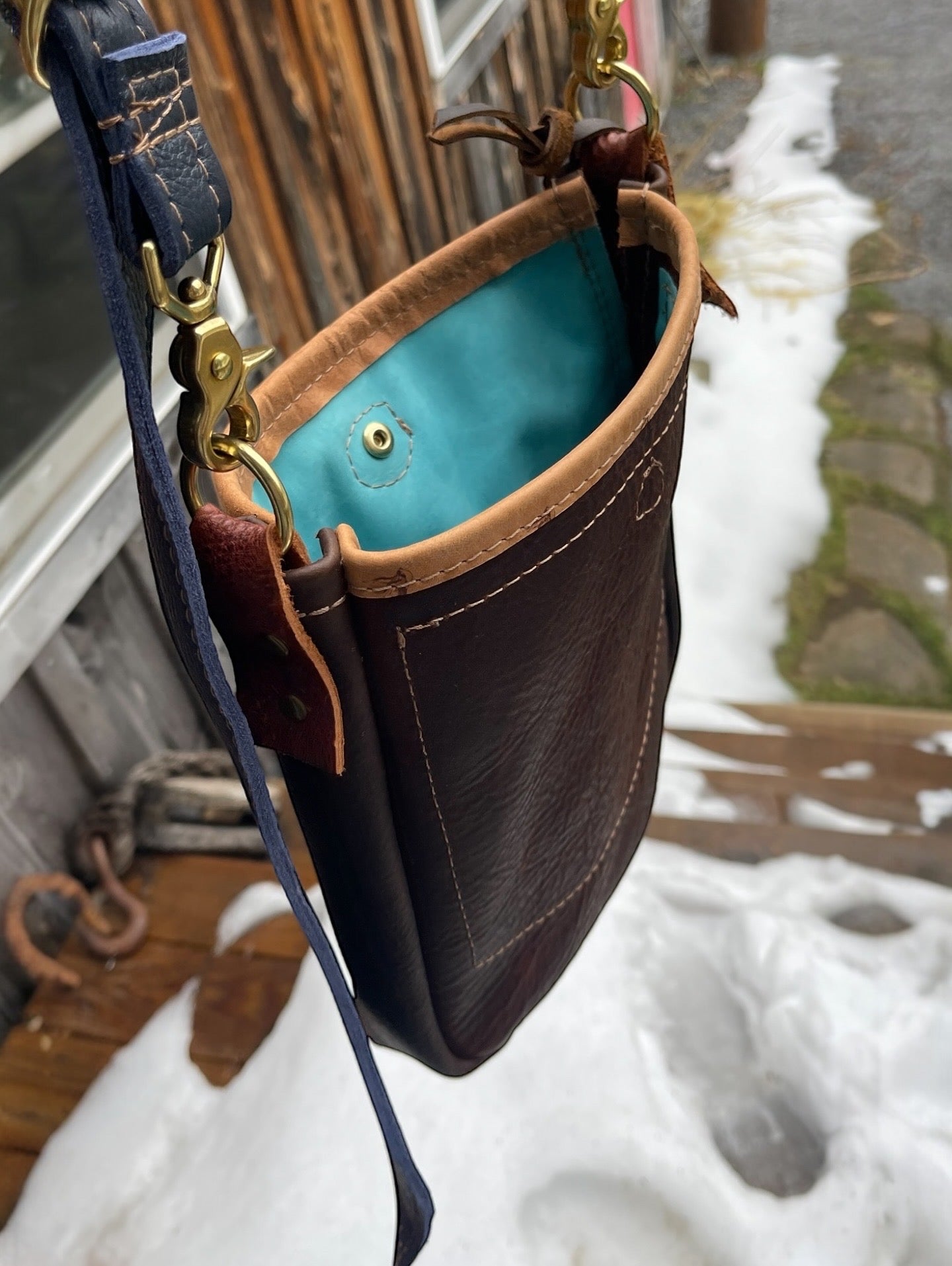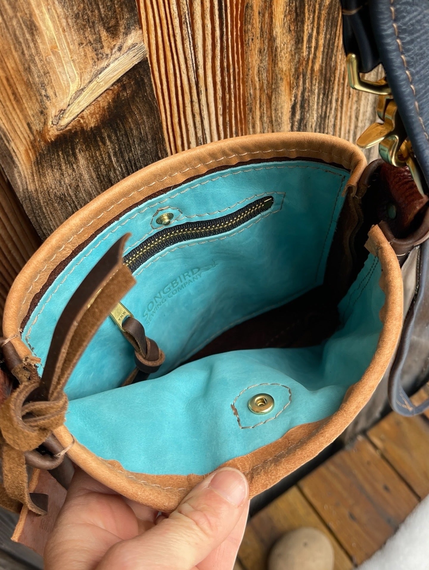 This one of a kind bag mixes brown leathers with a pop of navy on the sunrise and in the strap. Inspired by a cool November sunrise in upstate New York.